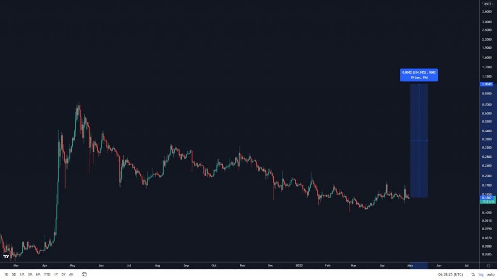 ارز دیجیتال دوج کوین (DOGE) در لحظه نوشته شدن این مطلب (۱۰ اردیبهشت ۱۴۰۱) در حدود قیمتی ۰٫۱۳۶۷ دلار معامله میشود و برای رسیدن به قیمت ۱ دلار نیاز به رشدی ۶۳۵ درصدی دارد. گفتنی است که این ارز دیجیتال قبلا نیز رشدهای شدید و نجومی را تجربه کرده است، به شکلی که در سه ماه اول سال ۲۰۲۱ توانست رشدی ۹۵۰۰ درصدی داشته باشد و به سقف قیمتی ۰٫۷۳۹۰ دلار برسد، بنابراین خیلی دور از انتظار نیست که با یک رشد شدید دیگر بتواند قیمت خود را به ۱ دلار برساند.